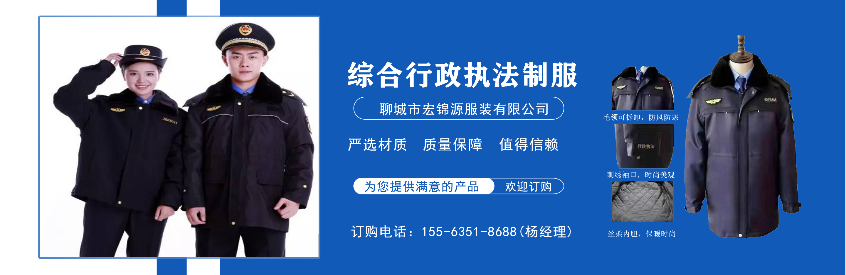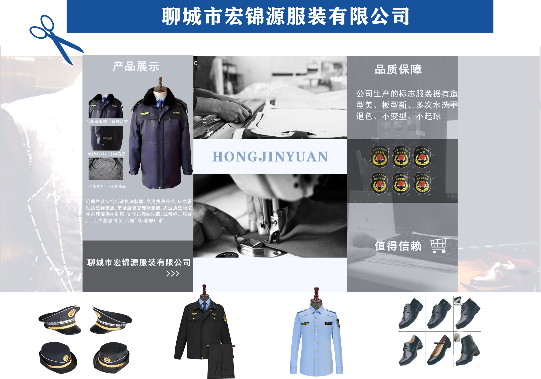 聊城市宏錦源服裝有限公司位于江北水城—山東聊城,地理位置優(yōu)越,交通便利。公司主營綜合行政執(zhí)法制服,交通執(zhí)法服裝,應(yīng)急管理執(zhí)法標(biāo)志服,市場(chǎng)監(jiān)督管理標(biāo)志服,農(nóng)業(yè)執(zhí)法服裝,生態(tài)環(huán)境保護(hù)制服,文化市場(chǎng)執(zhí)法服,城管標(biāo)志服裝廠,衛(wèi)生監(jiān)督制服,六部門標(biāo)志服廠家等,值得信賴! 公司生產(chǎn)的標(biāo)志服裝據(jù)有造型美、板型新、多次水洗不退色、不變型、不起泡。 “認(rèn)真辦事,踏實(shí)做人”是宏錦源的企業(yè)精神,我們的宗旨是:“用服務(wù)與真誠來換取你的信任與支持,互惠互利,共創(chuàng)雙贏!”我公司愿與國內(nèi)外各界同仁志士竭誠合作,共創(chuàng)未來企業(yè)目標(biāo):在已選定的服飾領(lǐng)域中,成為行業(yè)的卓越者。 經(jīng)營理念:追求產(chǎn)品卓越,為用戶提供完美、高效的服務(wù)。...